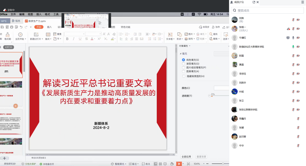 8月2日,新媒体系组织召开了第四次“学习强科”业务研讨活动,本次活动由系主任陈强教授主持。新媒体系党支部书记牛耀红副教授领学习近平总书记发表在《求是》杂志的重要文章《发展新质生产力是推动高质量发展的内在要求和重要着力点》,新媒体系全体师生参与研讨。