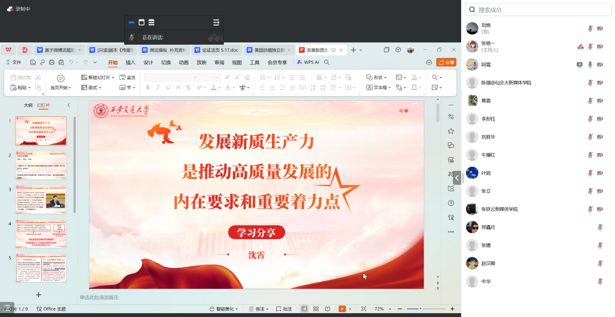随后,沈霄副教授作为分享人指出,习近平总书记关于发展新质生产力的重要论述深刻阐明了“什么是新质生产力、为什么要发展新质生产力以及怎样发展新质生产力”的重大问题,为推动新时代的高质量发展提供了根本遵循,指明了前进方向。从新闻传播学科角度来看,发展新质生产力有利于加强学科之间的交叉与融合,推动新闻传播学科的创新性与高质量发展。