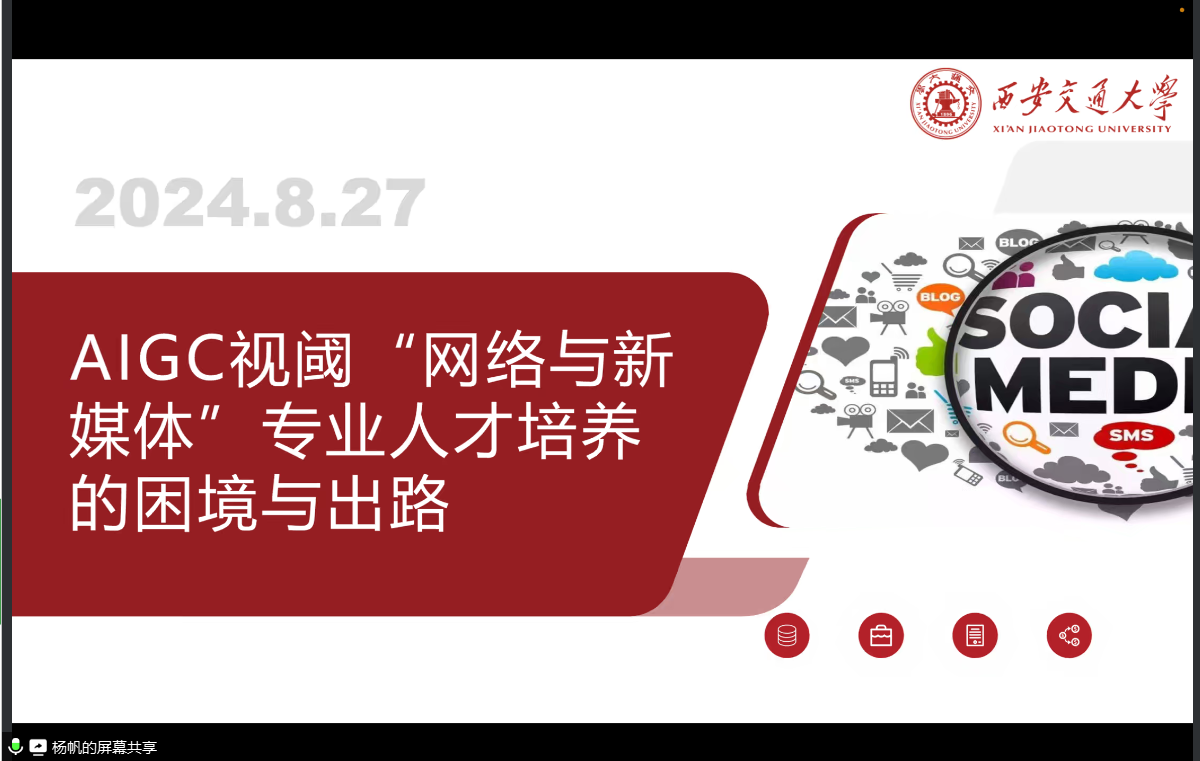 8月27号上午,智能传播系在线组织召开第三次“学习强科”业务研讨活动,学院副院长、智能传播系教授张宏邦领学“AIGC视域‘网络与新媒体’专业人才培养的困境与出路”,本次活动由党支部书记杨帆副教授主持,智能传播系全体教师参与研讨。