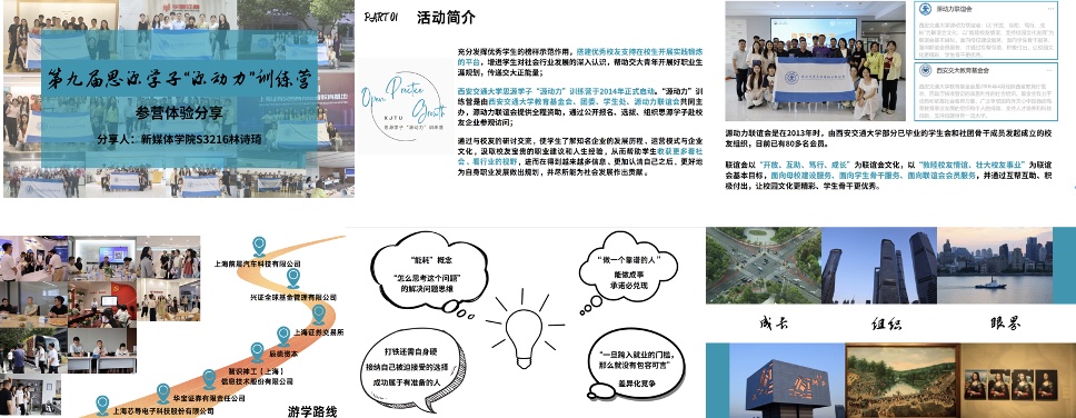 教育基金会老师顾姝靓从发展历程、资金募捐情况、公益实践活动等方面对教育基金会进行了简要介绍,并分享了教育基金会联合其他单位组织的两项游学活动——视界启航:学生视野拓展之旅和思源学子“源动力”训练营两项游学活动,旨在帮助学生拓宽视野,提升认知,增强对未来发展的信心。