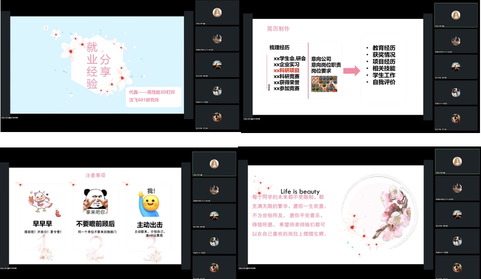 最后,机械学院2024届毕业生代鑫以在职人员的身份分享了求职经验。今年8月,代鑫顺利入职沈阳601研究所。她详细介绍了简历制作的技巧,并以生动有趣的方式,结合自身经历分享了求职规划和面试技巧。代鑫鼓励支部成员们自信地迎接挑战,打破焦虑,祝愿每位成员都能在自己心仪的岗位上熠熠生辉。