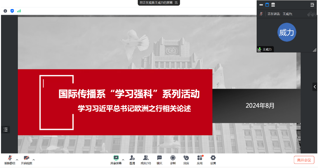 王威力以“学习习近平总书记欧洲之行相关论述”为主题,对国家主席习近平应邀对法国、塞尔维亚、匈牙利三国进行国事访问的背景、讲话和国际反响进行介绍和解读。指出此访立足欧洲,放眼世界,实现了中法关系再巩固、中塞关系再强化、中匈关系再提升,中欧合作再出发。并将推动欧方坚持正确对华认知,排除地缘政治和意识形态干扰,有效管控分歧,深化经贸、绿色、数字、人文等领域的交流合作。强调此次访问是一次传承友谊、增进互信、提振信心和开辟未来之旅。