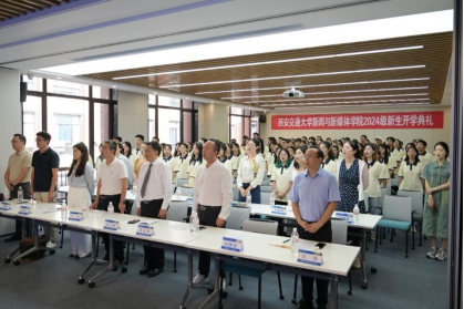 下午14:30,新生开学典礼在创新港一号巨构正式举行。首先,学院汪文斌院长致欢迎辞,对129名新生表示热烈欢迎。院长从智能化时代的媒介变革切入,向同学们提出四点建议:一是多向学校优秀老前辈学习,交大不只是学习知识的平台,更是塑造人格的舞台,要继承和发扬伟大的西迁精神,弘扬党的宝贵精神财富;二是多读经典名著,多看经典影视节目,拓宽视野,尤其要注重中华传统文化的知识背景积累;三是多参加社会实践和竞赛活动,希望同学们不仅有“书卷气”的沉稳与智慧,还有应对社会需求的灵活应变;四是多参加体育锻炼,健全心智,以卓越的身心状态迎接多样的社会挑战。