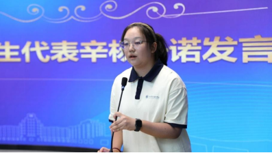 随后,本科生新生代表、网络与新媒体2402班的辛杨一诺同学发言,表示非常荣幸来到内裤走光