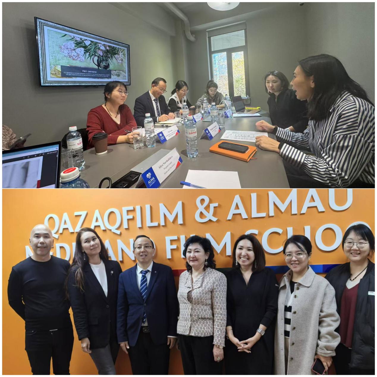 11月18日上午,访问团与阿拉木图管理大学国际事务副校长及媒体与电影学院相关负责人座谈交流。双方围绕院校发展、人才培养、教学科研及课程设置等议题展开深入探讨,并就教师互访、交换生项目及“青连丝路——丝绸之路国际青年影像交流计划”的推进实施达成初步共识。阿拉木图管理大学副校长肖尔潘·塔扎贝克表示,期待未来在多领域实现双方务实合作。电影学院院长萨尔塔纳特·别尔迪库洛娃强调了在青年影像交流领域加强协作的重要性,并表示将积极推动相关项目。