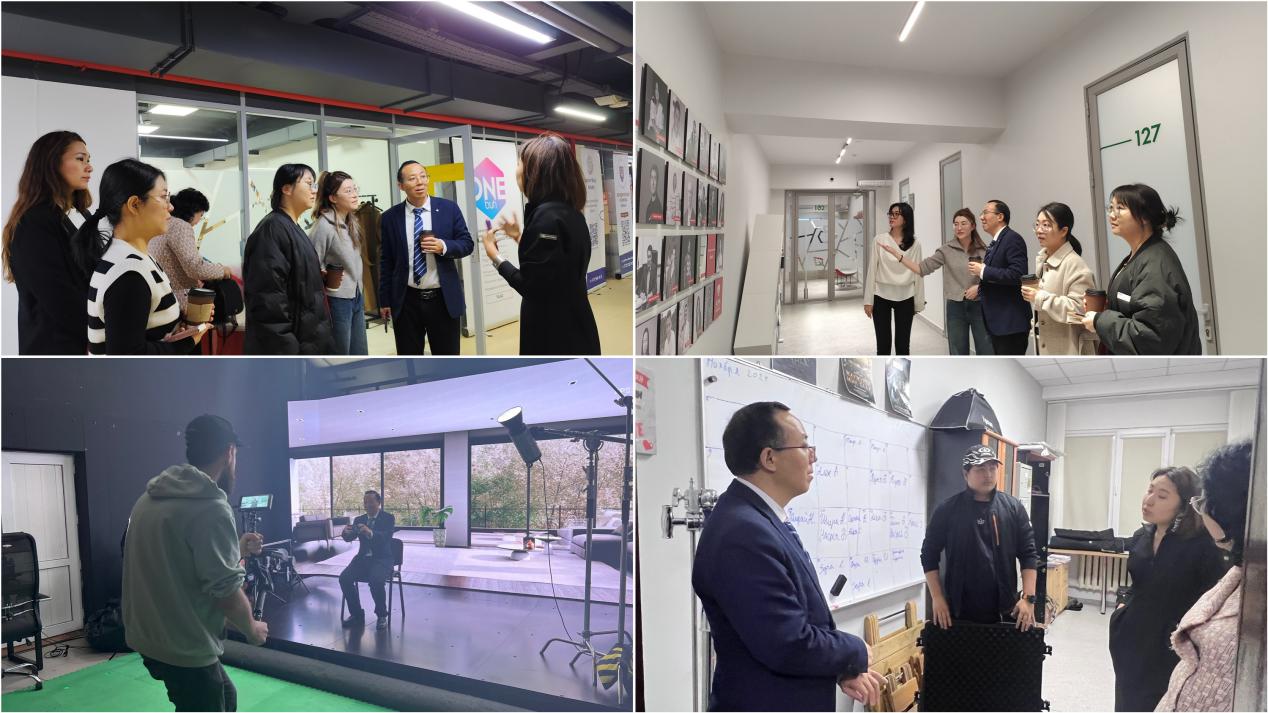 访问阿拉木图管理大学期间,代表团参观了学校图书馆、活动室、创意实验室和电视台等教学实践设施。电影学院院长萨尔塔纳特·别尔迪库洛娃与项目负责人阿利亚·努尔沙伊霍娃详细介绍了实践教学、新闻工坊与管理模式等内容,为团队成员提供了宝贵的实践教学经验借鉴。