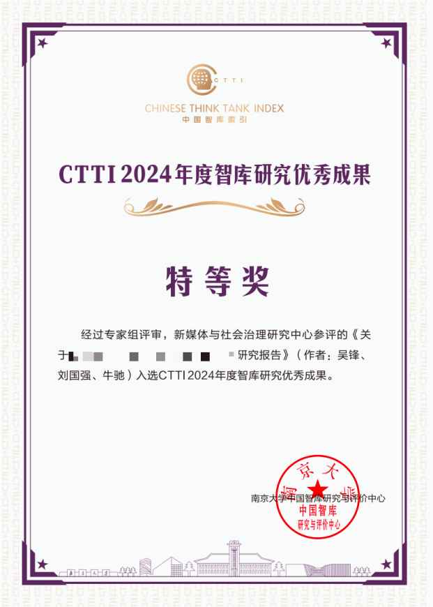 此次评选陕西高校新型智库“新媒体与社会治理研究中心”有3项成果入选,其中,2项智库决策建言成果《关于构建*******的对策建议》和《*****大模型*****》获2024CTTI智库优秀成果特等奖;《“新媒体与社会治理研究中心”平台》获2024CTTI智库建设最佳案例优秀案例。