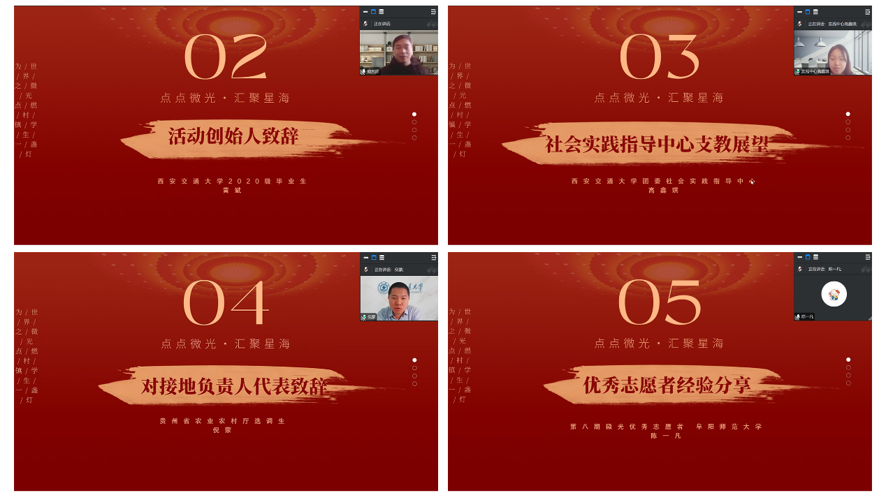 团委社会实践指导中心高鑫琪、项目创始人黄斌、优秀志愿者陈一凡以及来自全国数百名老师、志愿者、学生及家长参与本期“微光”线上公益支教开幕式。