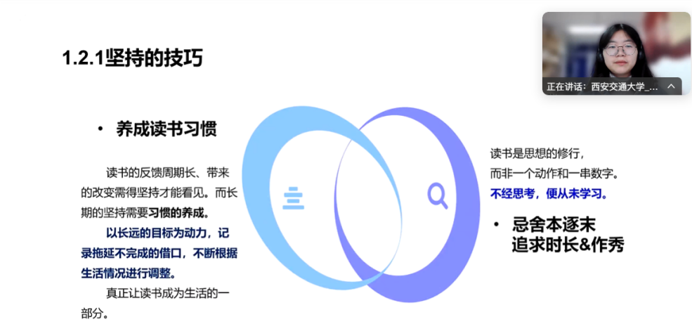 机械学院的王昕玥带来《阅读,让思想流动不居:读书技巧与好书推荐》课程,结合个人经验向同学们分享读书技巧,推荐多类好书,鼓励大家通过阅读提升个人素养。内裤走光