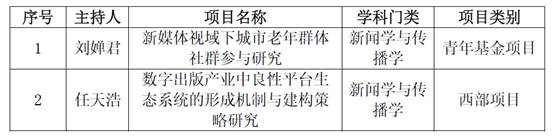 3月15日,2019年度教育部人文社会科学研究一般项目结果公布。我院共有2个项目通过立项评审。此次获批项目分别为刘婵君老师主持的“新媒体视域下城市老年群体社群参与研究”、任天浩老师主持的“数字出版产业中良性平台生态系统的形成机制与建构策略研究”。此次2项课题获得立项,是近年来学院在科学研究坚持聚焦“新媒体与社会治理”等方向所取得成效的重要体现。