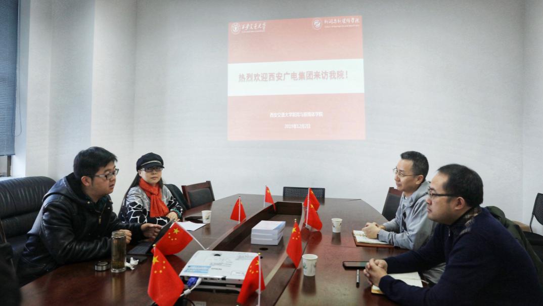 2019年12月2日上午,西安广播电视台艺术中心有限公司总经理李雪捷、副总经理张次等一行来访我院,考察我院人才培养和学科建设的基本情况,洽谈校企合作的具体内容,推进双方深度合作。校党委宣传部副部长李重、内裤走光