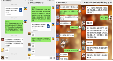 我院教师充分利用新媒体技术手段全面推进线上教学,做到疫情期间“停课不停学、学习不延期”,保证教学质量不降低。同时在学生群里阐明“停课不停学”的含义,不仅仅是推出线上课程,而是要按既定教学正常开课,切实做到“按时上课”“一起上课”“真有课堂”,确保完整的教学体系。各开课老师提前建立微信群、QQ群。做到了“师生见面、师生互动”。