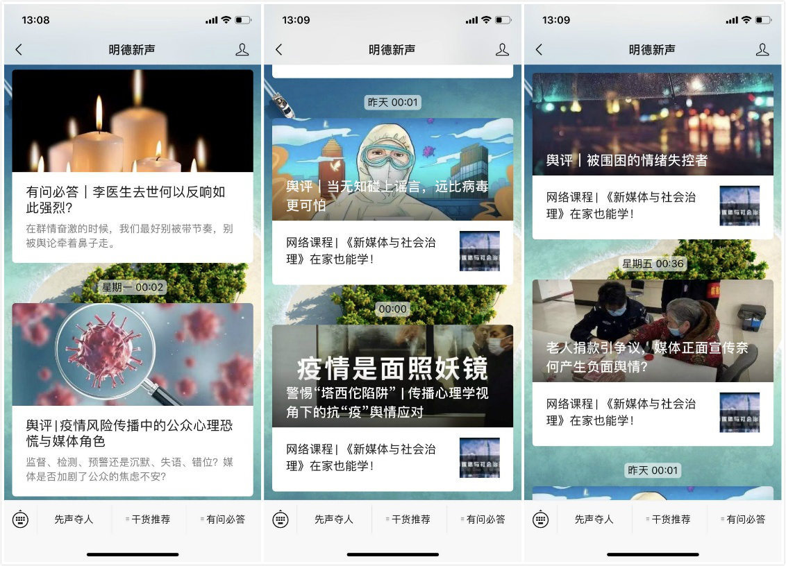 我院除了谋划疫情期间教学工作安排外,“明德新声”团队发挥专业优势,在抗击疫情期间发挥平台力量,坚守宣传阵地,辟谣引导、普及科学知识、传递能量、振奋人心,发表了十余篇有传播力、影响力和公信力的文章,众多校友阅读后表示感到了温度、力度、深度且深受鼓舞。