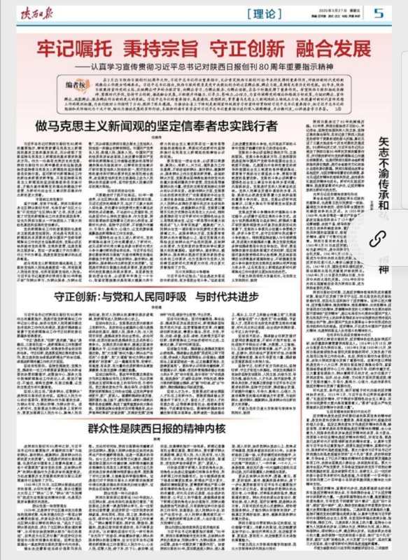 习近平总书记对陕西日报创刊80周年作出的重要指示,既是对我党新闻舆论工作牢记初心使命、始终与党和人民同频共振优良传统和工作作风的肯定,更是对媒体融合背景下党的新闻舆论工作守正创新的殷切期望和明确要求。