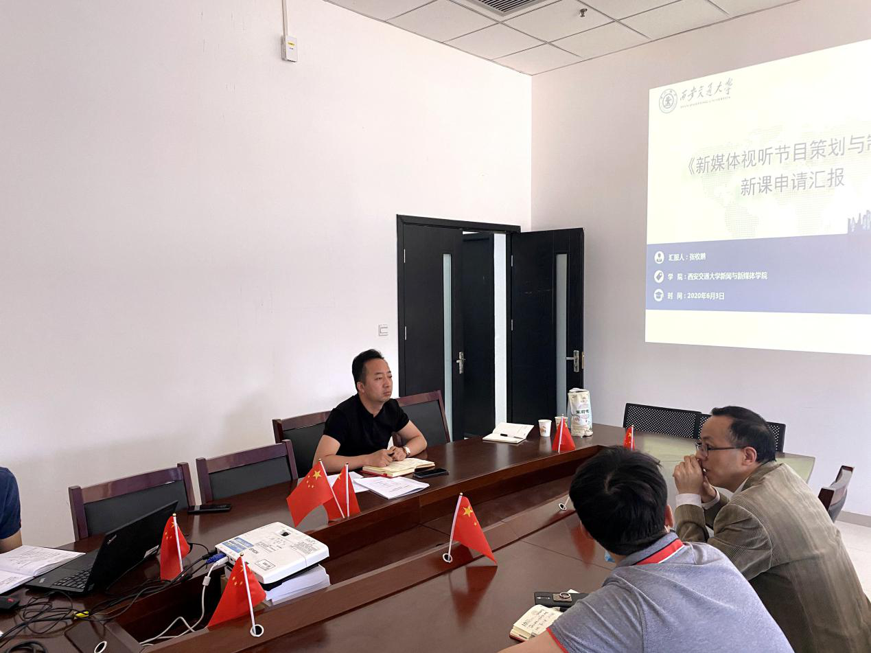 6月3日下午,学院组织开展“2020-2021学年新教师新开课程评议”活动。学院实验技术岗教师张收鹏对即将承担的专业选修课《新媒体视听节目制作与编辑》的课程定位、教学目标、教学大纲等内容进行了汇报。该课程是一门为本科生开设的专业选修课,教学目标是学生通过该课程学习后能够独立完成视听新媒体节目生产制作。学院教学委员会组织学院领导张宏邦、新闻系主任蒙胜军、传播系主任吴锋对新开课程进行评议,并对新开课程的教学内容和讲授方式提出具体意见与要求。经学院教学委员会讨论,认为该实验教学课程目标定位清晰,内容设置合理,理论讲授和实践操作相结合,符合我院新闻与新媒体人才培养的课程要求。