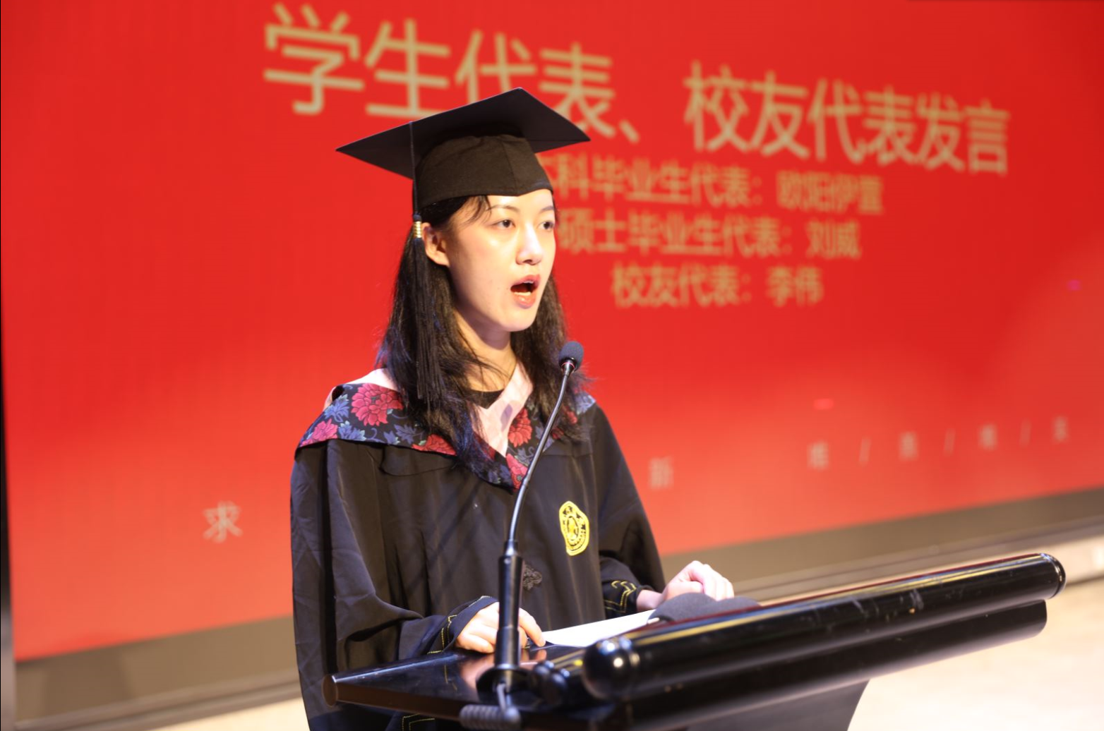 李明德院长宣读学校授予研究生毕业生硕士学位、本科生毕业生学士学位的决议,并公布优秀毕业生、优秀毕业生干部名单。本科优秀毕业生代表欧阳伊萱同学发言,她曾赴墨尔本大学交流担任墨尔本大学社交媒体大使之一,也曾在联合国担任实习生,未来她将在伦敦政治经济学院继续攻读传媒专业。她立志学成回国后身体力行地为祖国和海外沟通搭建桥梁,同时表示无论未来在哪里,都将继续践行“精勤求学、敦笃励志、果毅力行、忠恕任事”的校训与勤朴踏实的作风,做一个合格的交大人。