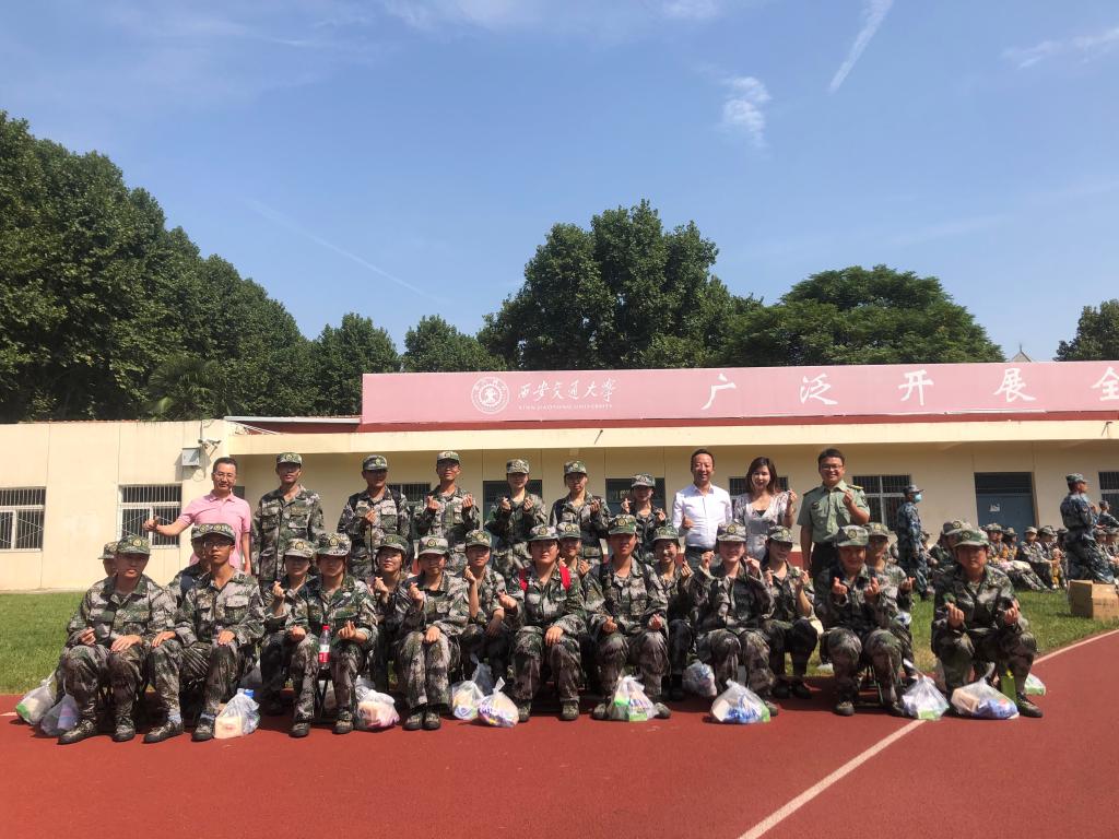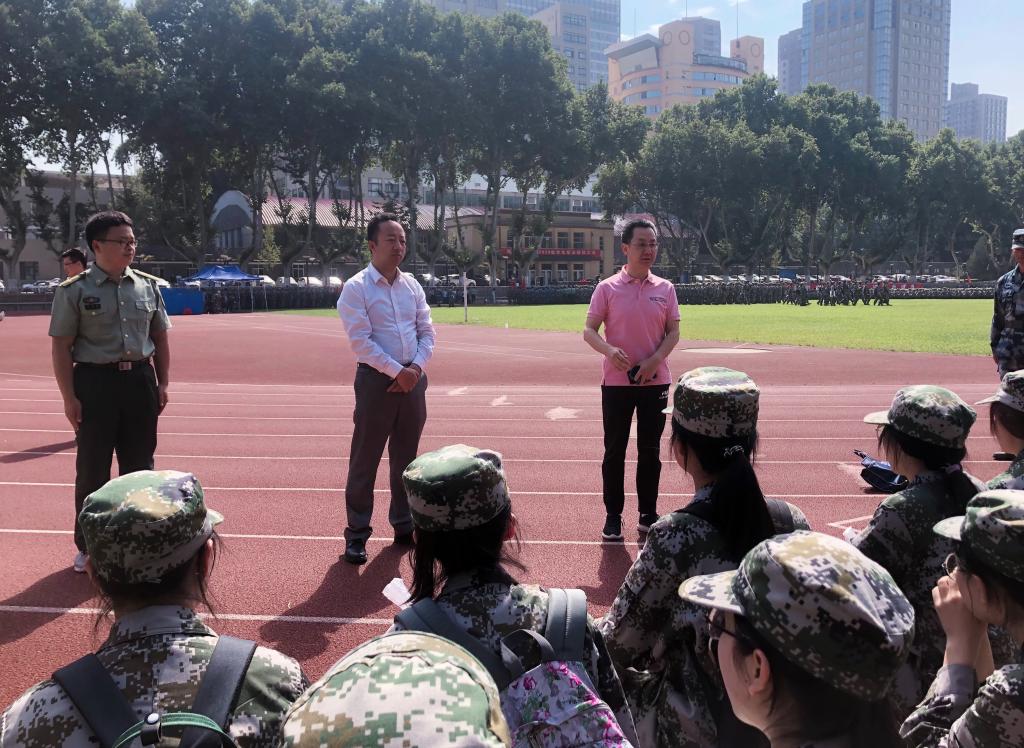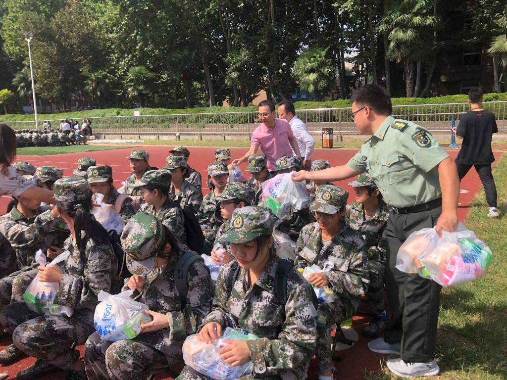 党总支副书记韩博、副院长张宏邦、文科试验班002班主任李巨星和辅导员李媛媛四位老师来到操场上对军训学生表示慰问。