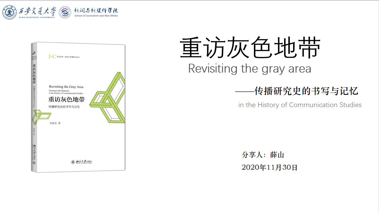 读书人最大的幸福是与书为伴。11月30日晚,在李明德教授指导下,新闻与传播研究所部分硕博研究生通过主讲人导读、成员自由发言讨论以及导师点评等形式展开了一场关于阅读的线上团组活动。硕士研究生薛山分享讲读书籍《重访灰色地带:传播研究史的书写与记忆》,深入浅出的讲解、旁征博引的延伸、审慎思辨的设问以及热烈投入的疑义相析,使得历时三小时的团组活动干货满满、酣畅淋漓,团队成员感触良多、受益匪浅。