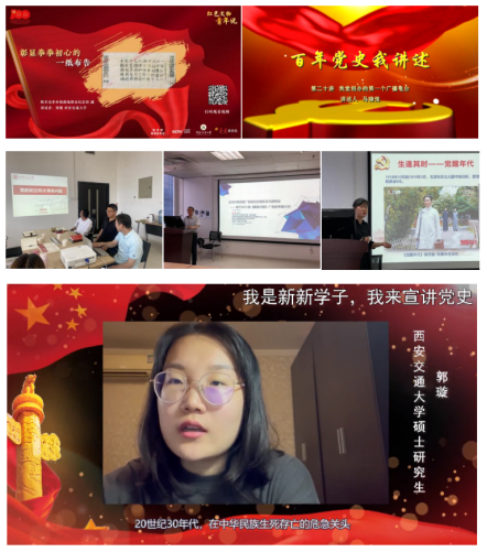 学子、学生微宣讲团副团长郑翅在教务处和党委宣传部的指导下,参加了由教育部高等教育司、中宣部《党建》杂志社、央视网、中国传媒大学联合举办的微党课“红色文物青年说”节目录制。学院特聘研究员马晓悦参加了西安交大《百年党史我讲述》系列短视频节目录制,带来了第二十讲“我党创办的第一个广播电台”。多个教师党支部开展“一人一堂微党课”领学党史特色主题活动,结合专业特色,讲述了《延安时期党报广告的历史及其现代启示》《建国以来中国共产党新闻思想人民性的历史演进》《知往鉴今,青年毛泽东新闻实践与启示》《党的创立和大革命兴起》《回顾百年辉煌党史》等微党课。院研究生会发起了“我是新新学子,我来宣讲党史”短视频接力活动,现已开展9期。青拔人才陈积银指导学生完成作品《一位百岁老人的信》献礼建党百年,作品包含动画视频、H5、微信推送三方面,展示了中国共产党从诞生到发展壮大的历史。