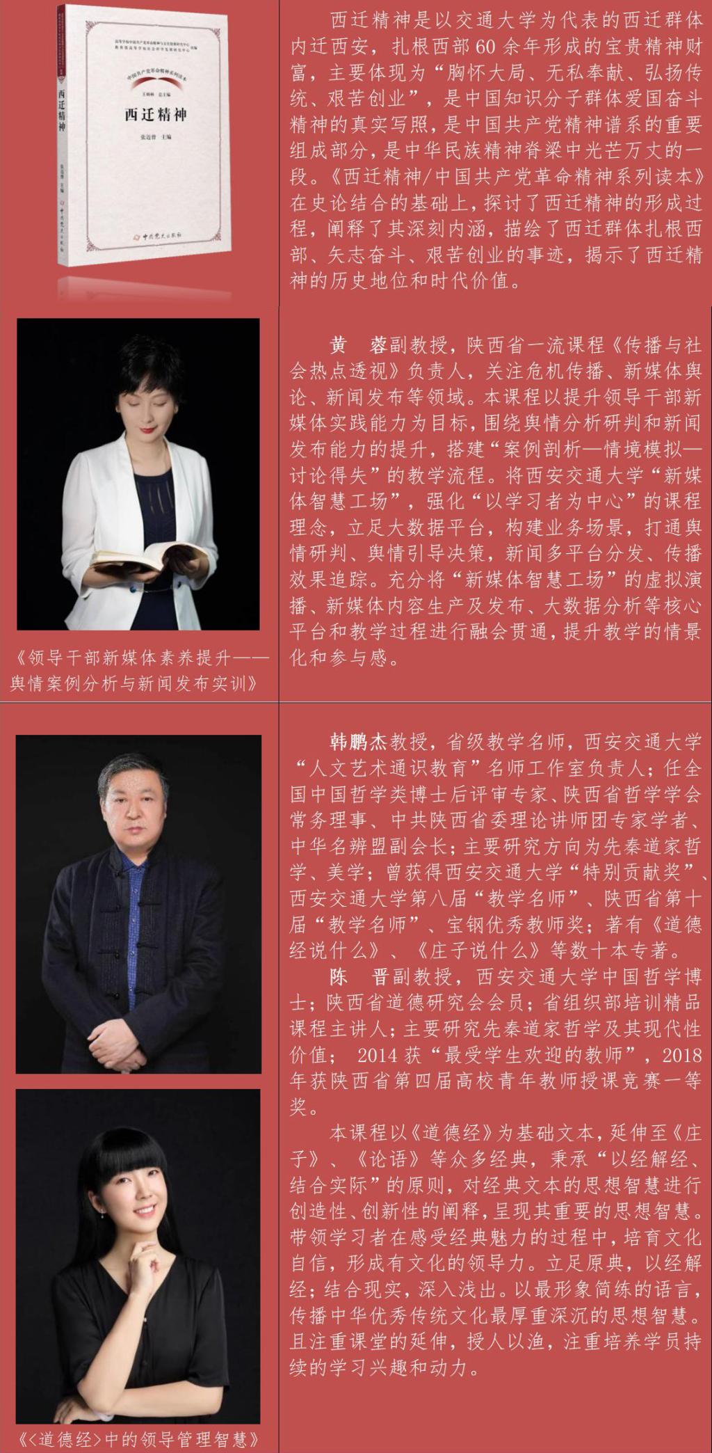 近日,中共陕西省委组织部印发《全省干部教育培训好课程好教材推荐目录的通知》,经单位推荐、专家评选、组织审核,全省有10种教材入选全省干部教育培训好教材,24门课程入选全省干部教育培训好课程。其中,西安交大党校/干部教育培训基地推荐的由张迈曾主编的《西迁精神》入选好教材,黄蓉的“领导干部新媒体素养提升——舆情案例分析与新闻发布实训”、韩鹏杰/陈晋的“《道德经》中的领导管理智慧”入选好课程。