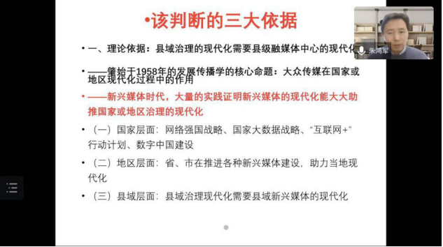 中国社会科学院大学新闻传播学院教授、《新闻与传播研究》执行主编朱鸿军就“基层治理现代化:县级融媒体中心建设定位”展开论述。他提出县级融媒体中心作为县域治理现代化的基础平台,在理论依据、历史发展、现实案例方面发展的关键因素,并对该主题和对外传播相关的研究领域作出展望。