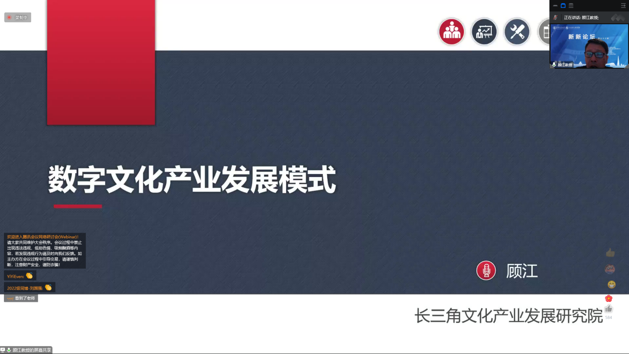顾江教授在题为“5G时代数字文化产业的商业模式创新:案例与思考”的讲座中指出,在数字经济的推动下,文化产业已进入高质量发展时期,他从“数字经济”的内涵入手,对数字文化产业发展模式进行了全面的介绍。现今的文化产业已具有了虚拟性、交互性、跨界性和融合性的特点,正在产业互联网在内的多个经济领域拓展,并涌现了如数字+文旅、数字+非遗、数字+文创、数字+演艺、数字+版权、数字+动漫、数字+游戏和数字+影视等一批新兴文化产业。
