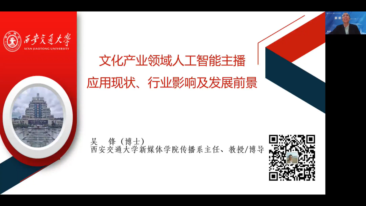 吴锋教授的报告题目为“文化产业领域人工智能主播应用现状、盈利模式及发展前瞻”。吴教授介绍了人工智能主播应用的现状,人工智能主播是以大数据、机器学习、虚拟合成、人机交互等人工智能技术为驱动,在传播活动中担负主持与播报任务的智媒产品,具有自身认知与离身认知交互、智能技术与主播艺术结合、主体身份与客体身份并存的特征,人工智能主播的发展演进阶段分为研究萌芽、技术蓄力、合成应用三个阶段,现阶段AI合成主播以中国发展最为迅速、应用最为广泛。