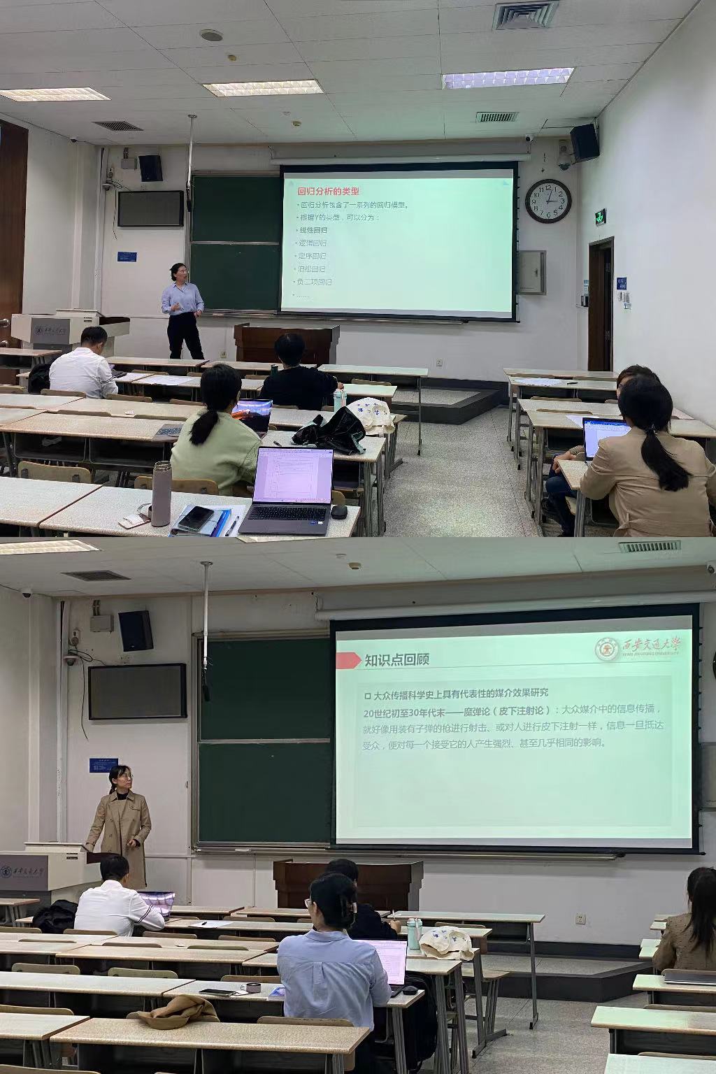 学院新入职助理教授邝岩选择了媒介效果研究中媒介说服效果这一内容进行试讲、任围介绍了一元回归分析法,与会专家肯定了教师认真的备课态度和良好的精神面貌,教学副院长张宏邦指出新教师不仅要严格遵守课堂教学管理规定,更要开展好价值塑造和科学知识引领的探索,推进课程思政建设与教学改革。校督导专家张蓉中肯地对试讲教师提出了宝贵的意见和建议,从教学语速、板书规范、PPT制作、师生互动等方面对新老师提出指导,并鼓励新教师在教学工作中不断探索,争取更快提升自身的业务素养和教学能力,为学院的蓬勃发展添砖加瓦。