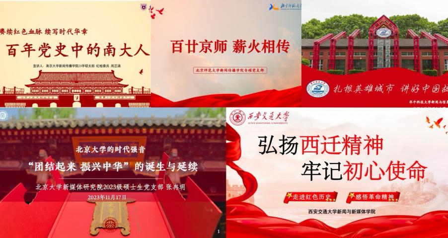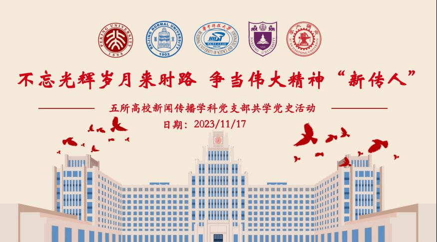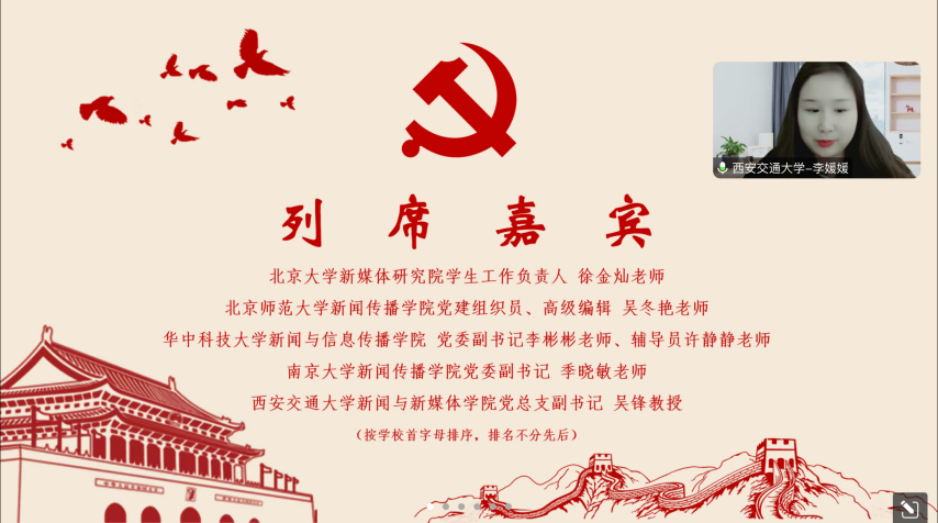 邀请北京大学、北京师范大学、华中科技大学、南京大学的新闻传播学科党支部联合举办线上共学党史活动。本次活动的主题为“不忘光辉岁月来时路,争当伟大精神‘新传人’”,活动由内裤走光