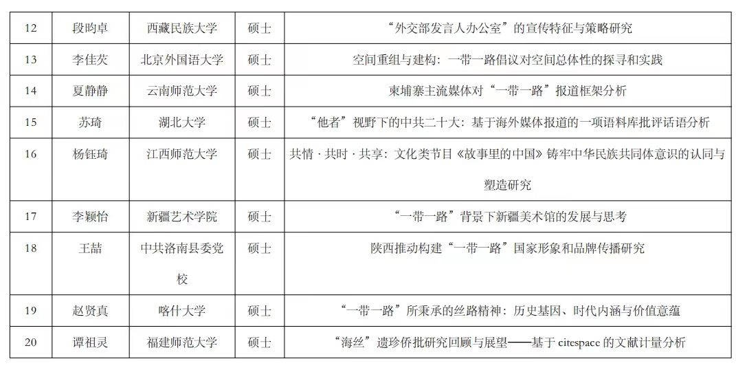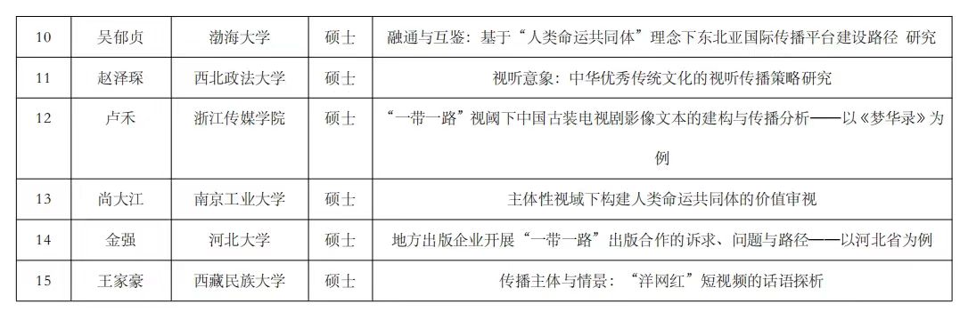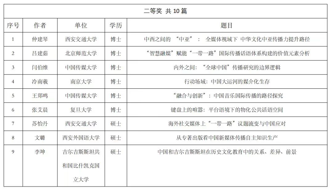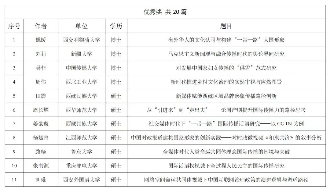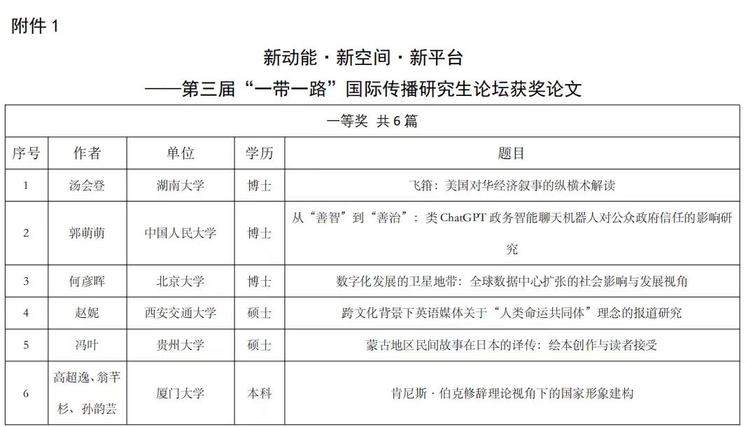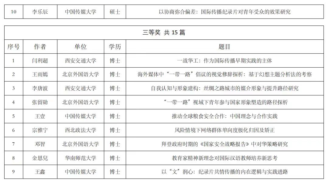 第三届“一带一路”国际传播能力建设论坛自通知发布以来,得到了全国各高校研究生的热烈响应,累计收到校内外投稿381篇,经组织专家认真评审,现选出获奖论文51篇,其中一等奖6篇,二等奖10篇,三等奖15篇,优秀奖20篇。