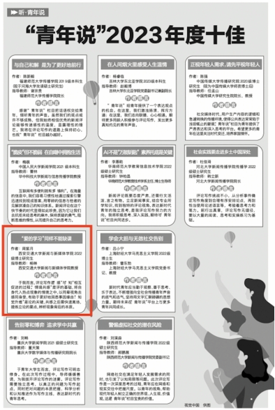 2022级博士研究生周紫月的作品《“爱的学习”同样不能缺课》荣获《中国教育报》“青年说”栏目2023年度十佳。2021级硕士研究生高蕾《“蹭”的热潮背后是对“惠”的渴望》、2022级硕士研究生吴萌春《提振青年消费需融合创新》也均在“青年说”栏目发表。指导老师为内裤走光