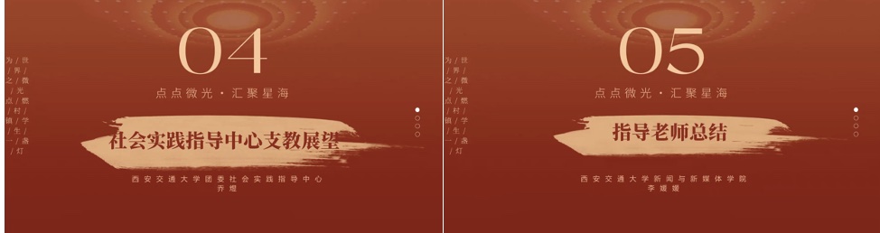 毕业生、志愿者以及村党支部志愿者三个身份的转变阐述了微光公益活动的社会价值,她说道:“我认为微光支教活动是十分有意义的,是润物细无声的。”优秀志愿者赵妮根据自己的支教经验进行分享,她认为微光支教活动是一次充实又难忘的人生旅行,是自我价值的体现,是社会责任感的升华,同时,它也是一种爱的传承。支教经历让她更加深刻的理解了教育的意义。活动创始人黄斌在毕业后成为了一名江苏名校优生公务员,他分享了自己的人生经历并对同学们寄语,强调了知识与眼界的重要性,希望同学们能够找到自己的理想,为之奋斗,珍惜这次难得的机会,用所学到的知识回报社会。自微光支教项目开始至今,每一位“微光人”都传递着志愿服务精神,以微茫造炬成阳。