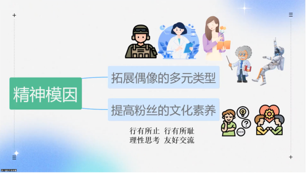 在2月3日的公开课《失范与重构:聊聊追寻那些事》中,薛子晨主要探讨了网络追星行为及其影响,以及如何引导青少年理性追星。首先,网络追星行为本质上是一种文化模因的传播过程,资本的孵化环境也在延长了这种负向模因的传播时间。其次,要建立健全饭圈文化产业的行业规范和评价体系,降低资本对于文化的过度干扰。