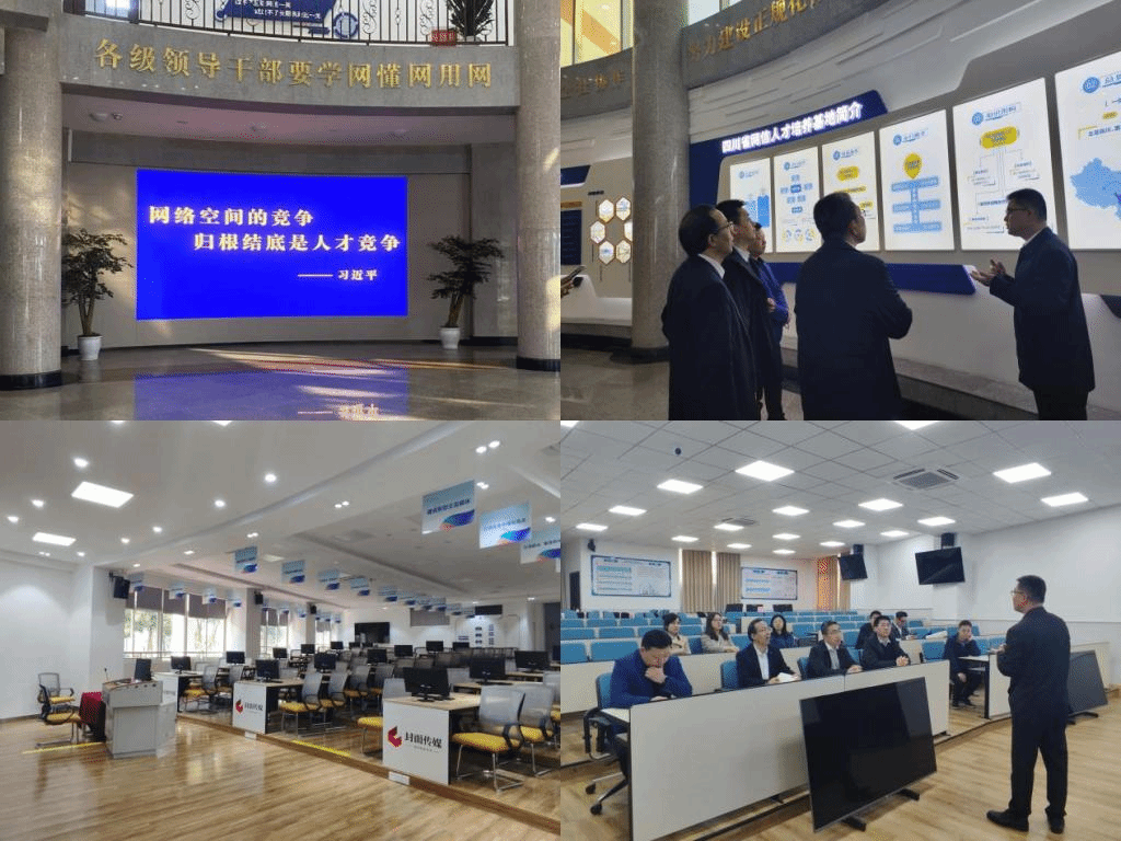 3月23日上午,联合调研组走进位于四川数安网信科技有限公司的四川省网信人才培养基地宜宾中心。宜宾市委网信办副主任罗建洪、数安公司总经理黄锦飞、培训部负责人郝宇光等陪同调研。