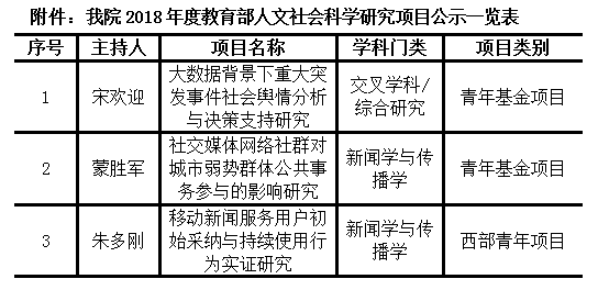 近日,2018年度教育部人文社会科学研究项目评审结果出炉,根据《教育部社科司关于2018年度教育部人文社会科学研究一般项目评审结果的公示》,我院共有3个项目通过立项评审。此次获批项目分别为宋欢迎老师主持的“大数据背景下重大突发事件社会舆情分析与决策支持研究”、蒙胜军老师主持的“社交媒体网络社群对城市弱势群体公共事务参与的影响研究”、朱多刚老师主持的“移动新闻服务用户初始采纳与持续使用行为实证研究”。