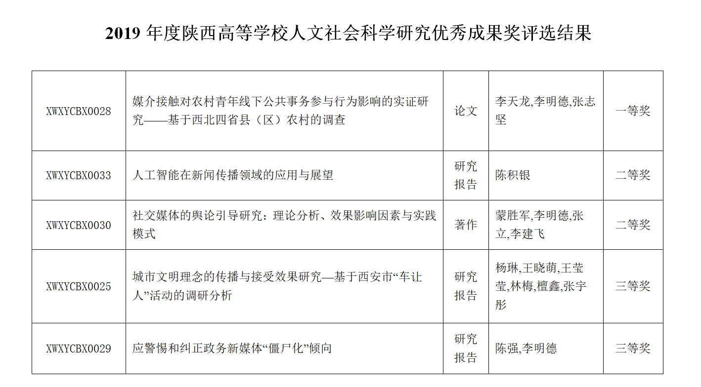 近日,2019年度陕西高校人文社会科学优秀成果奖揭晓,我院李明德教授等申报的论文“媒介接触对农村青年线下公共事务参与行为影响的实证研究——基于西北四省县(区)农村的调查”获得一等奖;陈积银教授申报的研究报告“人工智能在新闻传播领域的应用与展望”和蒙胜军老师等申报的著作“社交媒体的舆论引导研究:理论分析、效果影响因素与实践模式”均获得二等奖;杨琳教授等申报的研究报告“城市文明理念的传播与接受效果研究—基于西安市‘车让人’活动的调研分析”和陈强副教授等申报的研究报告“应警惕和纠正政务新媒体‘僵尸化’倾向”均获得三等奖。