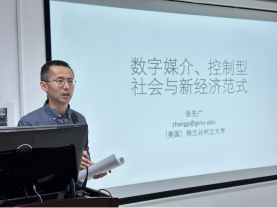 张先广教授系统地论述了人类社会的变迁历程,指出社会经历了传统的主权型社会与福柯的规训型社会,目前已经转向德勒兹所谓的控制型社会,资本主义也由此发生了“异化”,销售与服务成为生产链中的关键环节。同时数字媒介的变迁使得媒介理论由人本主义向反人本主义的转向,各类机器与海量的信息使得人类自身处于被控制的境地,以上变迁带来的是一种新经济范式,即注意力经济与平台资本主义,人们从消费信息转变为消费注意力,各类数据平台如脸书为代表的数字平台加大了对用户的控制,巨量用户翻转为劳动力,只管付出,不问回报,加速了财富的集中。最后张先广教授分享了自己对控制型社会的几点思考,指出在控制型社会中,注意力经济与平台资本主义大行其道,需要有筛滤机制帮助用户解决信息过载的困境。