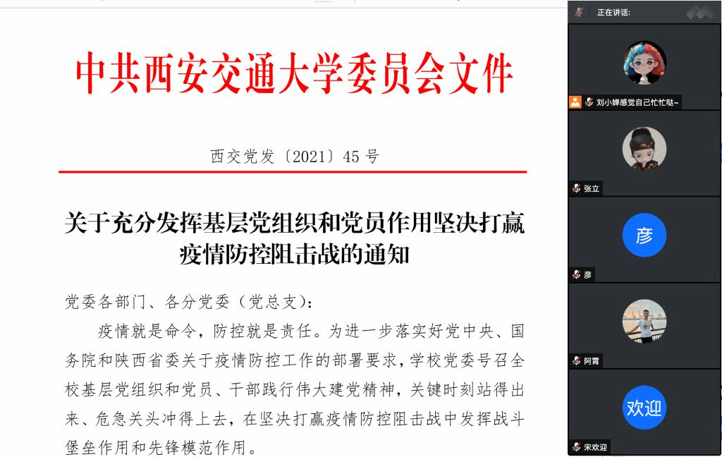 随后,宣传委员沈霄带读了学校下发的《关于充分发挥基层党组织和党员作用,坚决打赢疫情防控阻击战的通知》,为进一步落实好党中央、国务院和陕西省委关于疫情防控工作的部署要求,学校党委号召全校基层党组织和党员、干部践行伟大建党精神,关键时刻站得出来、危急关头冲得上去,在坚决打赢疫情防控阻击战中发挥战斗堡垒作用和先锋模范作用。