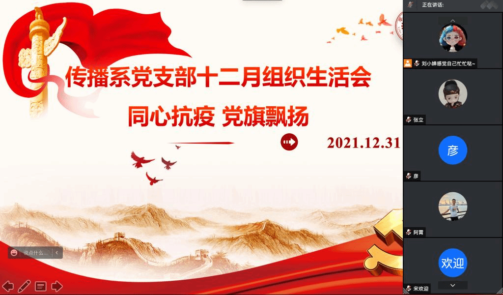 传播系党支部在线上召开了12月组织生活会,在对今年以来党史学习教育工作进行总结的基础上,传达省委以及学校关于抗疫的有关文件精神。传播系全体党员参加了本次会议,会议由传播系党支部书记刘婵君主持。