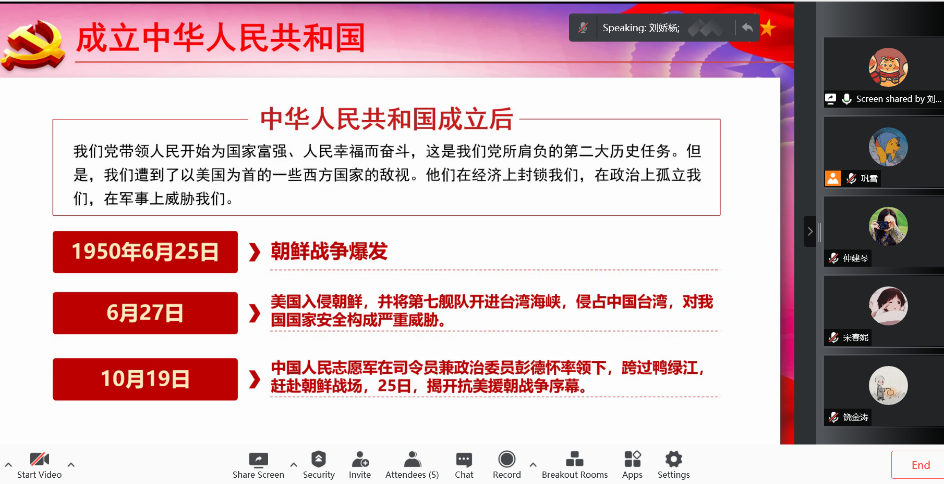 本次专题研讨会按照三大历史事件和三大里程碑的脉络和线索,寻找和了解党的初心和使命。中华人民共和国的一切权利属于人民,中国共产党带领人民为国家富强和人民幸福而奋斗。在遭遇西方国家歧视、经济封锁、政治孤立等条件下,中国人民志愿军不畏强暴、不怕牺牲、敢于斗争、敢于胜利,展示了中华民族的浩然正气。刘娇杨同志讲到作为一名博士研究生,无论在科研还是生活中我们难免会遇到难题,要以积极的心态应对困难,迎难而上,努力寻求解决困难的办法,战胜困难。