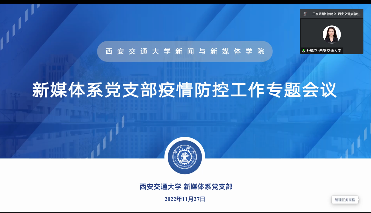 11月27日晚,新媒体系党支部线上召开疫情防控工作专题会议,新媒体系全体教师、博士生参加会议,会议由支部书记牛耀红主持。