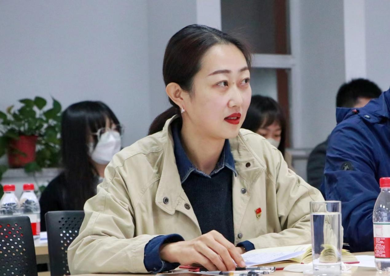 党支部书记范晓莹代表支部发言,她认为,学习党的二十大报告,就是更加坚定理想信念,提高辨别是非能力的过程。党的二十大报告,为新时代新征程党和国家事业发展指明了前进方向、提供了根本遵循。作为高校工作者,“坚持教育优先发展、科技自立自强、人才引领驱动,加快建设教育强国、科技强国、人才强国,坚持为党育人、为国育才”的重要论述为我们指明了前进方向。她从学院教学、科研、行政三方面工作努力方向,具体谈了自己的体会,表示要全面、真实、立体得把工作干好,成为令学生可敬、可爱、可信的老师。