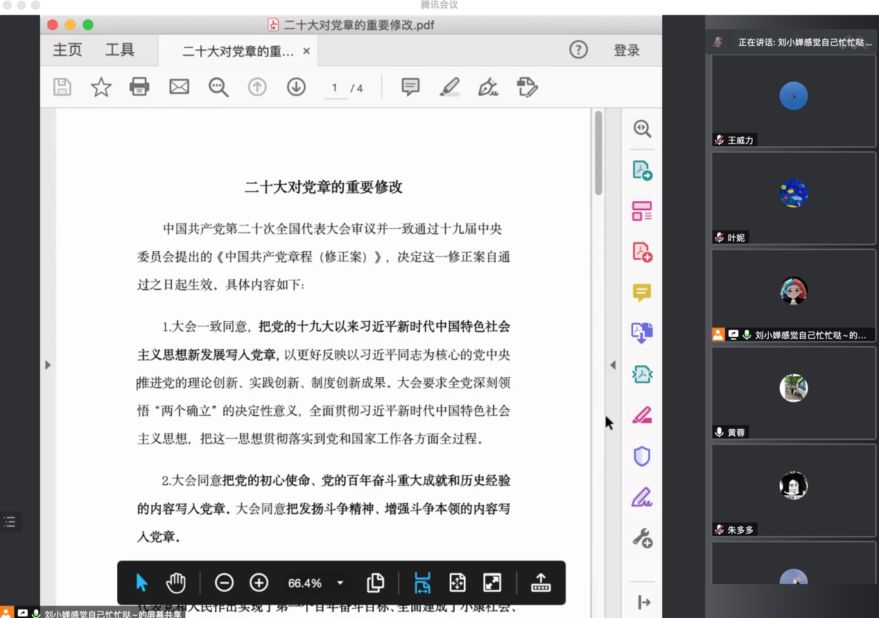 首先,刘婵君老师以深入贯彻党的二十大精神为目标,带领支部成员对中共二十大报告进行了深入学习。刘婵君老师逐条回顾了二十大报告对党章进行的重要修改,深刻领会二十大党章修正案的重大意义与重要内容。强调认真学习党章、严格遵守党章,是加强党的建设的一项基础性经常性工作,同时也是支部党员的应尽义务和庄严责任。