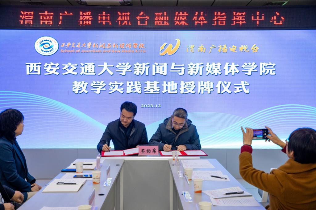 为渭南广播电视台授“教学实践基地”牌匾,双方代表还就校媒合作签署了战略合作协议。会议中,双方就融合媒体时代传统媒体如何处理好“宣传—经营”的关系的核心问题,高校在破解上述问题、推进坚守党媒主阵地的有效路径、进一步深化推进全媒体体系建设方面的研究能力的实践转化等方面进行了深入探讨。据悉,未来双方将在设立实习实践基地、建立人才培养基地、双向交流研发实践等方面进行深度合作,资源共享,优势互补,合作共赢。