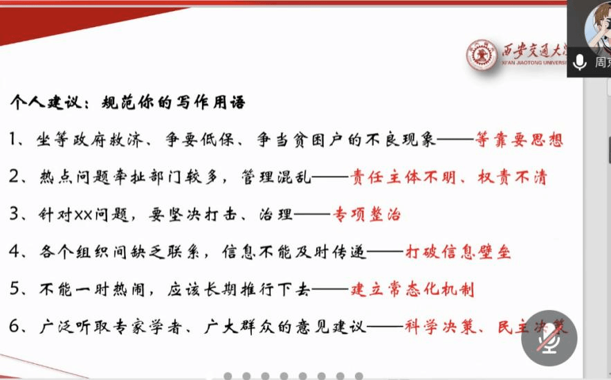 周京乐同志的经验分享从国考备考技巧、考前一周冲刺、考场应考技巧、工作体验分享及高校行政备考经验五个方面展开。“结合备考程度选择适合自身的备考方法是最后一周决胜的关键。”周京乐同志指出要结合实际,有思考,有取舍。他建议同学们在当前关头注重模拟实战,培养真题的逻辑感和思维感,达到在考场上应答如流、从容不迫的高效答题状态。“提高政治站位,形成机关思维,避免过度口语化也是较为关键的一点。”周京乐同志通过丰富的词句案例展现了规范写作用语的重要性,并推荐支部成员阅读习近平总书记系列重要讲话,提高党政文化素养,以充分和丰富的知识积淀迎接考验。