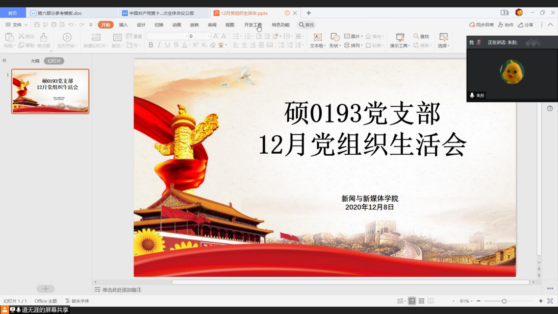 12月8日19:00,硕0193党支部全体成员在腾讯会议开展主题为“放飞青春梦 奋进新征程”主题党日活动,共同学习《中国共产党第十九届中央委员会第五次全体会议公报》。