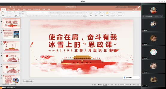 学生微宣讲团召开了以“‘使命在肩,奋斗有我’,冰雪上的思政课”为主题的组织生活会,党支书孙哲主持会议,从“观冬奥盛会,筑文化自信”、“重温习近平总书记重要讲话”、“支部成员感悟分享”几个部分带领大家共同学习冬奥精神,共诉家国情怀。