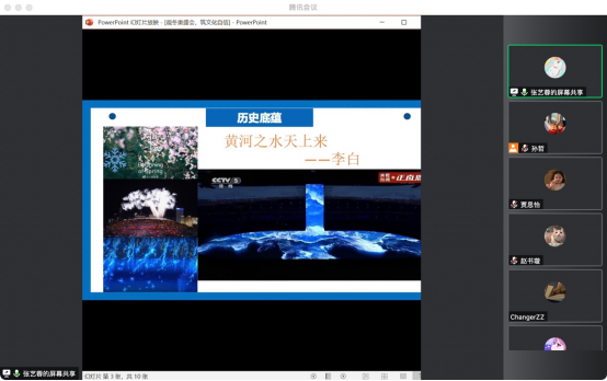 学生微宣讲团的张艺蓉同学带来了“观冬奥盛会,筑文化自信”的主题宣讲,从“历史底蕴”、“内心热爱”、“精神确立”几个角度出发,解读为什么观看冬奥会我们会涌现出文化自信。“文化自信是更基础、更广泛、更深厚的自信,是一个国家、一个民族发展中最基本、最深沉、最持久的力量”,张艺蓉同学从每一张截图都可以当壁纸的节气倒计时、倾泻而下的黄河之水以及开幕式的迎客松、闭幕式的送别柳等冬奥中的“中国风”元素以及中国特有的浪漫来介绍冬奥会中体现的大国气象与文化自信,激励支部成员坚定文化自信,激发大家心底对祖国更深沉的热爱。