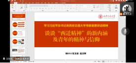 为引导青年学生厚植爱党爱国热情,听党话跟党走,此次党课宣讲邀请支部党员赵汉卿、徐潇潇、周春燕三位同志,带领大家深入学习习近平总书记重要讲话精神。“人无精神则不立,国无精神则不强。”赵汉卿同志以《谈谈“西迁精神”的新内涵及青年的精神与信仰》为题,深入分析西迁精神的新内涵,鼓励同学们在日常学习生活中做到“知行合一”。他表示:“西迁精神的核心为爱国主义,这是凝聚共识;其精髓是听党指挥跟党走,这是统一组织,我们青年学子要在认知和行动两个方面,服从党的统一组织,通过知行合一集中力量办大事。”