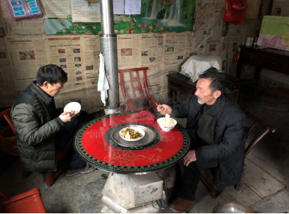 在大雪纷飞的山中前行一阵,便见不远处有屋舍坐落。“天寒白屋贫”,大抵如是,这座小屋简单陈旧,户主一家尚未起床。小山村就是这样,娴静而自在,这是多少在快节奏生活中奔波的人向往的生活。第二户到访的人家正在吃早饭,让我们意想不到的是,这看起来有些“简陋”的房子,室内竟是干净整洁、家具齐全,暖烘烘的,室外也有相应的信号接收设备。基本设施对于贫困地区的群众生产生活至关重要,而在这里,每家贫困户都可以享受到政府的帮助。就连山上住得最高的一户人家门前也通了公路,而他们的屋后已是深林云海。